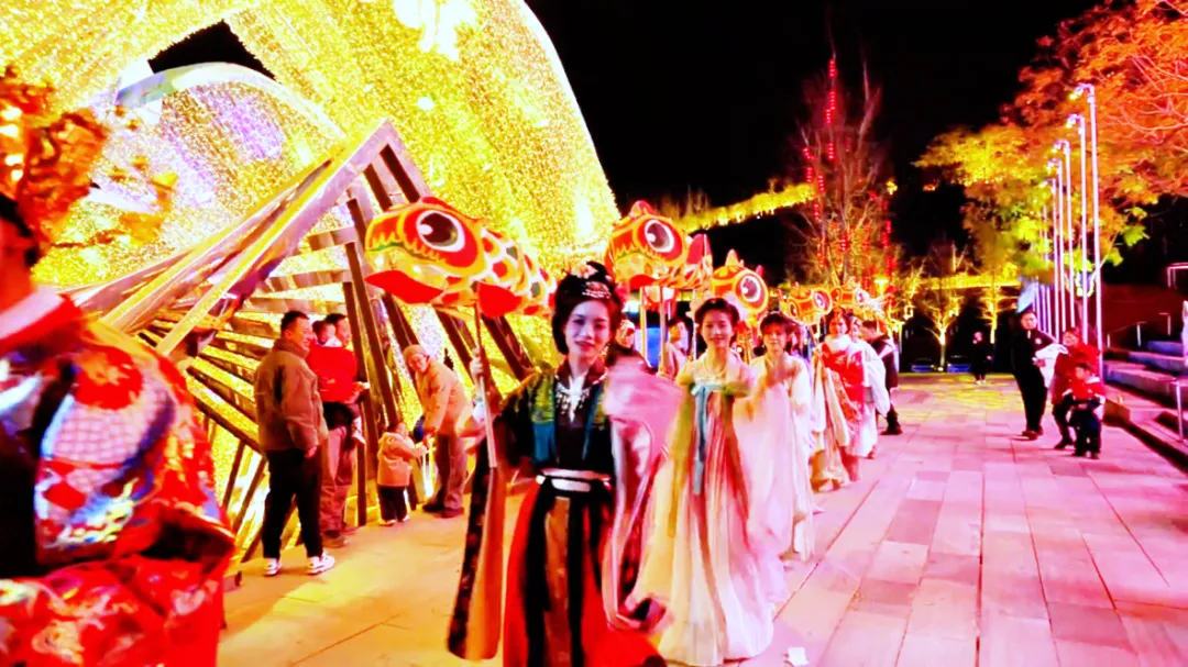 非遗铁花秀璀璨绽放,万千铁花如流星雨般倾泻而下,照亮夜空;紧接着,水上非遗火壶惊艳登场,火光与水影交织,技艺与激情碰撞,引得岸上掌声与喝彩声此起彼伏。在毛家坝码头,身着华美汉服的姑娘们手持鱼灯翩然巡游,衣袂飘飘,仿佛自画中走来;人群中,“财神”笑盈盈地派发着新春福礼,孩子们争相上前讨个彩头,祈愿新年好运连连。