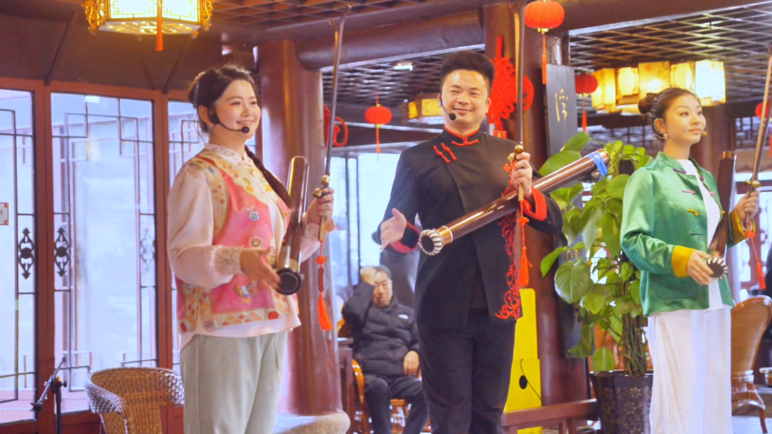 不远处的王爷庙则传来阵阵悠扬的曲乐。曲艺打击乐《燊海传奇》气势磅礴,敲响了=千年盐都的豪迈;曲艺串烧《盐韵芳华》宛转悠扬,尽显本土风情。盘子《春风送暖》清脆悦耳,竹琴《寻味》韵味悠长——传统曲艺在古戏台上轮番上演,台下座无虚席,叫好声不绝于耳。