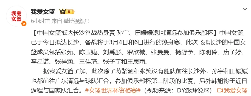 目前,跟随中国队前往长沙的还有13名球员,分别是王思雨、张茹、刘禹彤、张子宇、陈玉婕、罗欣域、张曼曼、杨舒予、陈明伶、唐子婷、李星诺、张梓涵、王佳琦。而此前跟随国家队集训的田媛媛、张笑等4人,他们则提前离队了。这也就意味着,这四人已经提前无缘世预赛最终大名单了。当然,女篮目前热身赛大名单,也并非是中国队最终阵容。