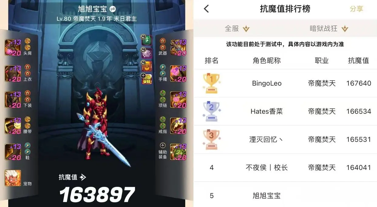 18号开服后,冰柠檬差一点就做出了编号第一的超武,刷了深渊后,抗魔已冲上了国服第二,我看了一下,第二天回落到第5了。