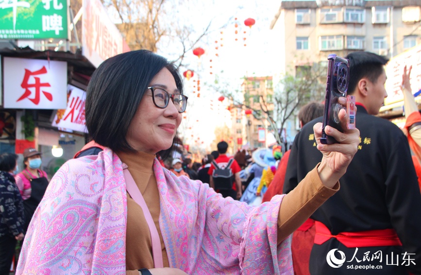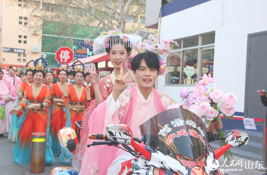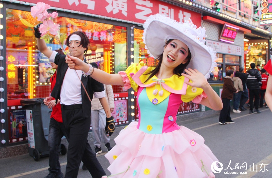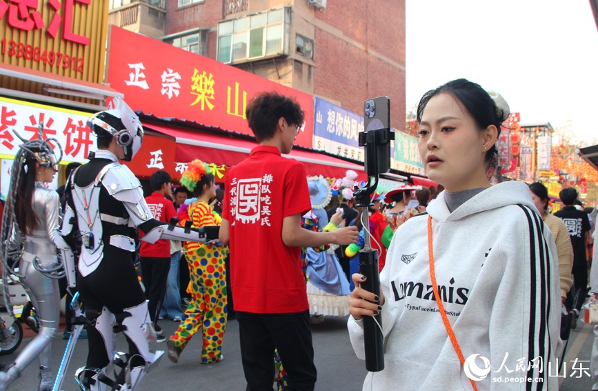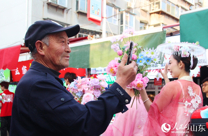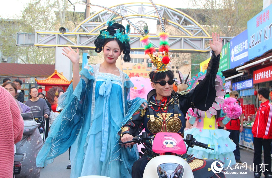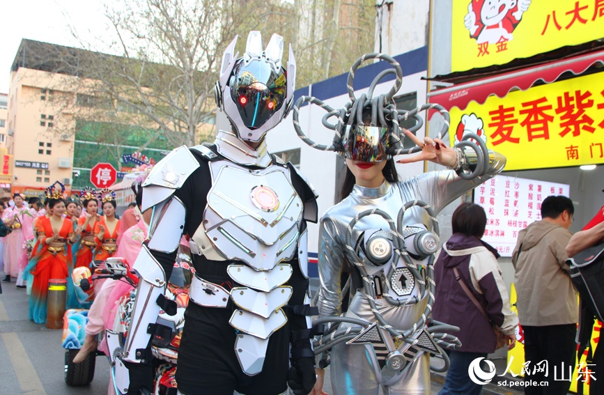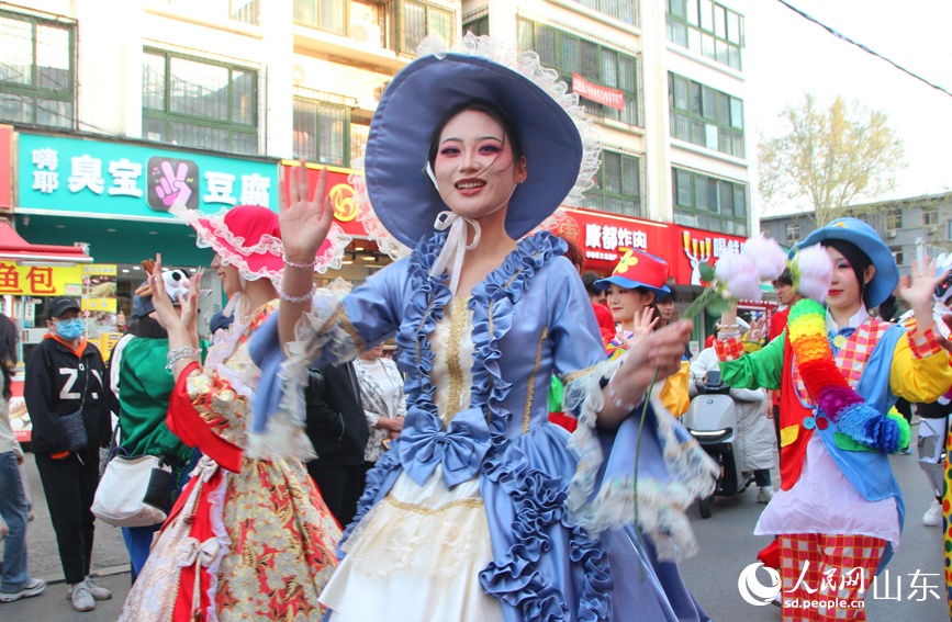 人民网淄博4月8日电(记者宋翠)每天下午6点,山东省淄博市张店区“八大局便民市场”上,热闹非凡的“巡游”开始了。巡游人群身着古典、现代、卡通等各色服装,走上街头,向游人友好地打招呼,和他们互动,吸引了许多游人拍照留念,跟着队伍“穷追不舍”。