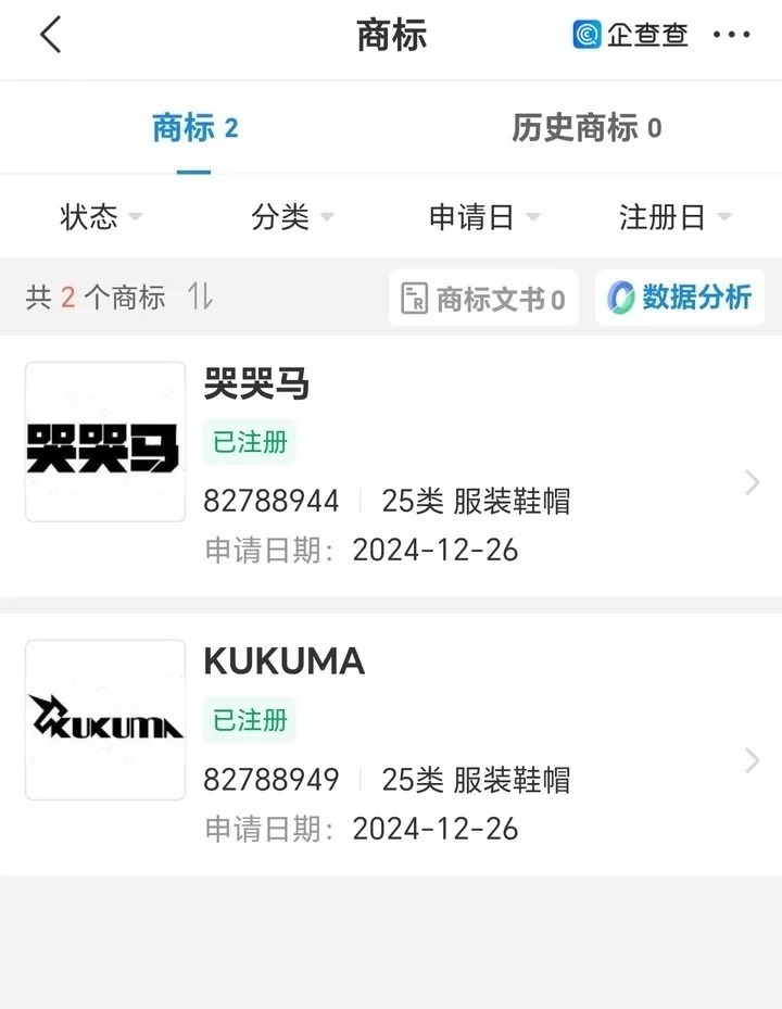 记者通过企查查平台查询发现,温州市卡温鞋业有限公司注册的商标类型为第25类“服装鞋帽”,专用权限从2025年6月28日持续到2035年6月27日。据了解,商标保护遵循“按类别确权”的原则,不同品类的商标互不冲突。只要义乌“哭哭马”厂家申请玩具商标,3个月后即可初审公告。