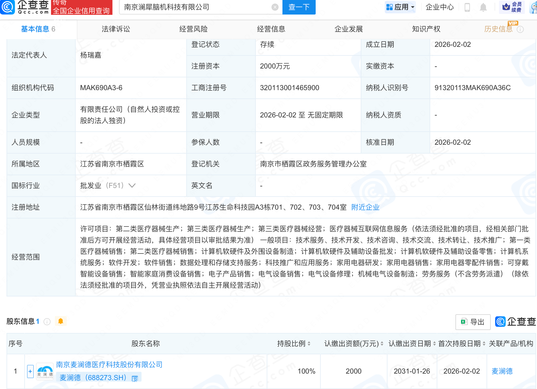 炒股配资开户识必选 麦澜德在南京成立脑机科技公司