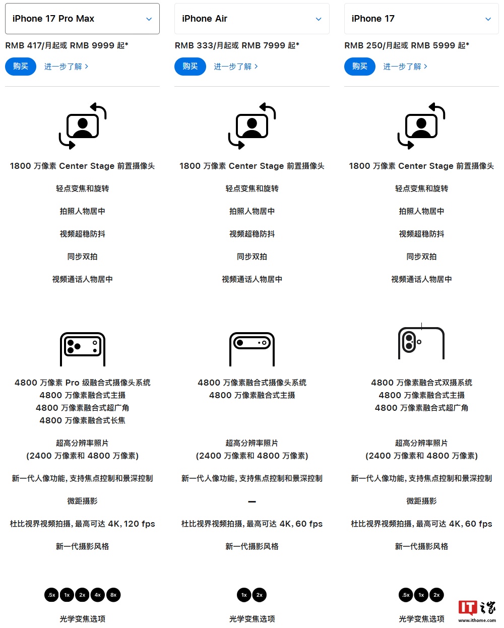 作为参考,本代 iPhone(iPhone 17 / Pro / Pro Max、iPhone Air)升级了 1800 万像素 Center Stage 前置摄像头(采用方形传感器),可实现轻点变焦和旋转、拍照人物居中等功能。